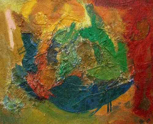 Großer bunter Korb, Öl, Mischtechnik auf Jute, 2005, 50 x 40